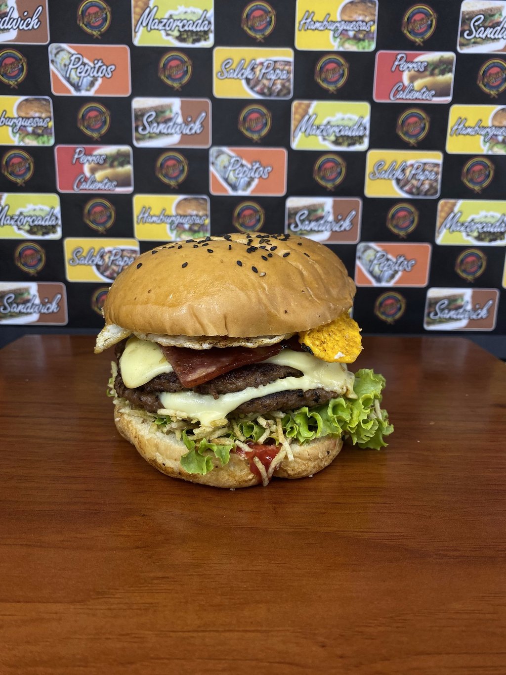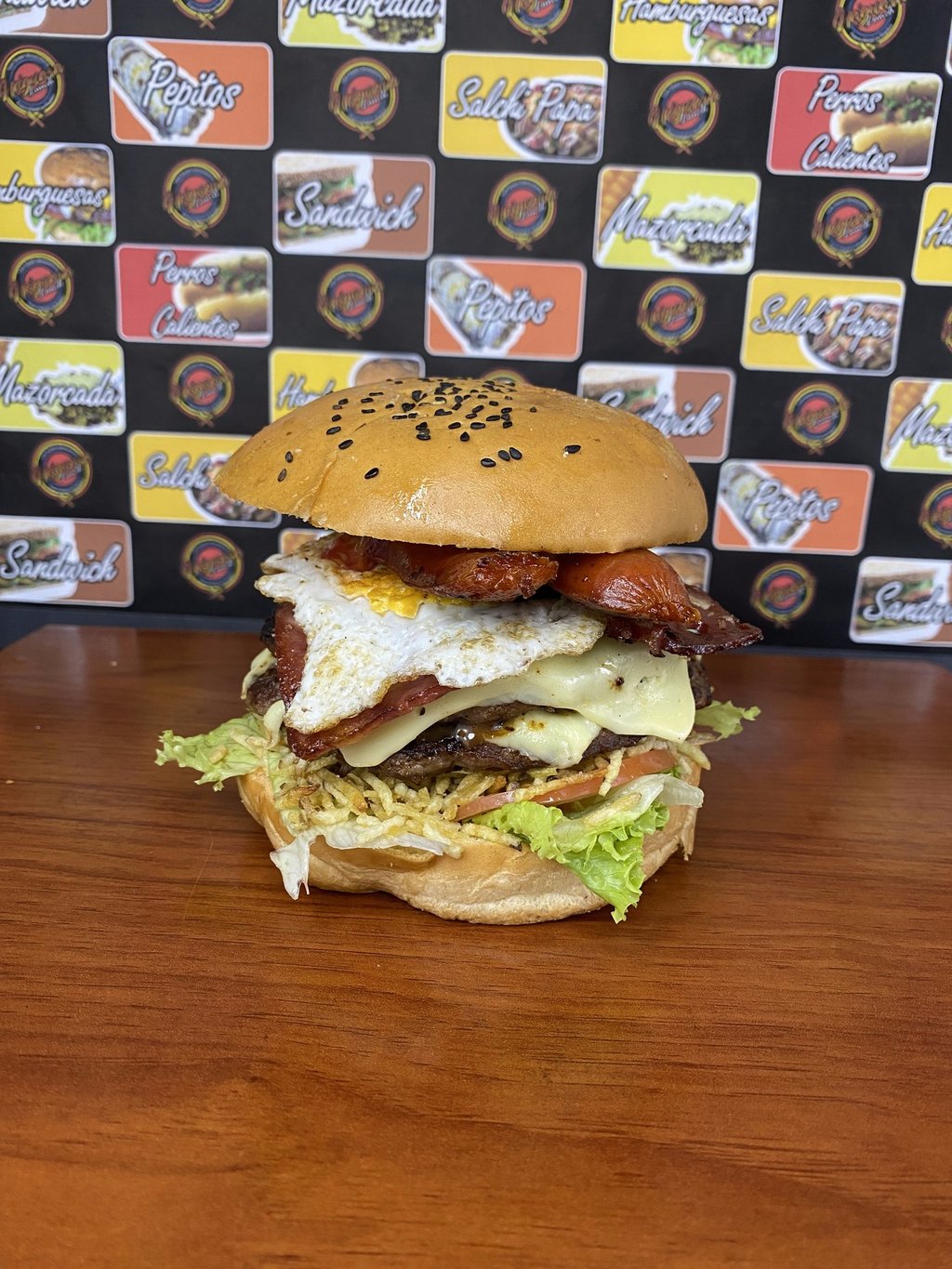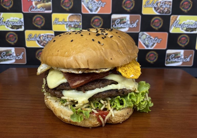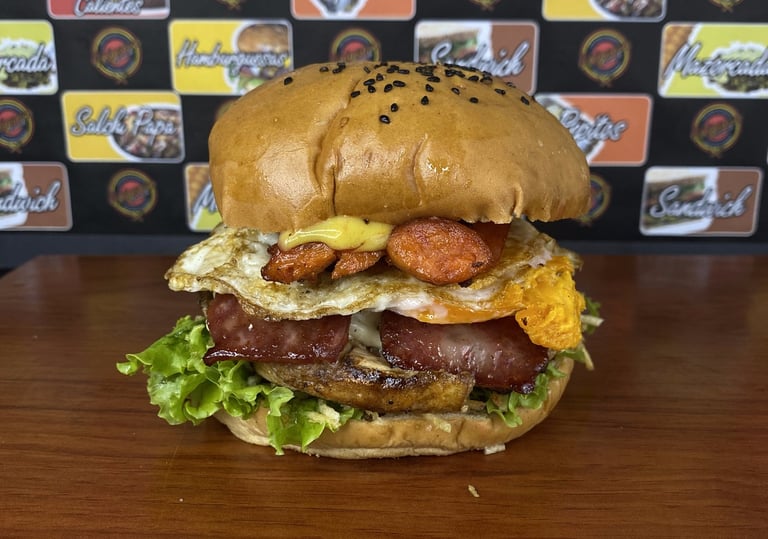Pan de Hamburguesa, 2 Carnes artesanales de 130 gr cada una, Lechuga, Tomate, Cebolla grillé, 2 Lonjas de Quesos, Tocineta, Huevo frito, Chorizo ahumado, Papitas Cabello de ángel, Salsas Tradicionales y de la Casa.