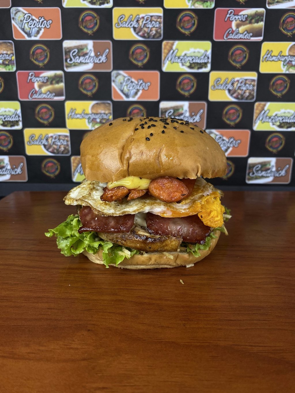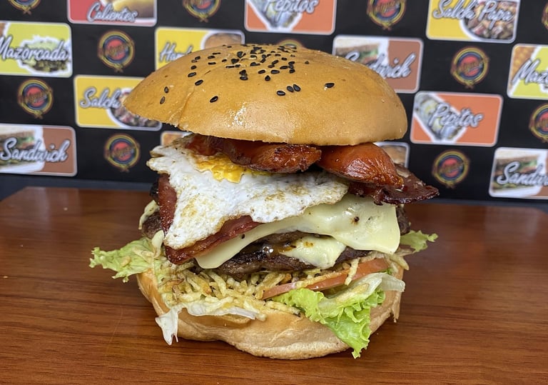 Pan de pepito, 1 Carne artesanal de hamburguesa de 130 gr + 130 gr de proteína entre (Res, Pollo y Cerdo), Lechuga, Tomate, Cebolla grillé, Queso cheddar y Queso doble crema, Jamón ahumado, Tocineta, Omelet de huevo con queso, Papas a la francesa, Salsas tradicionales y de la Casa.