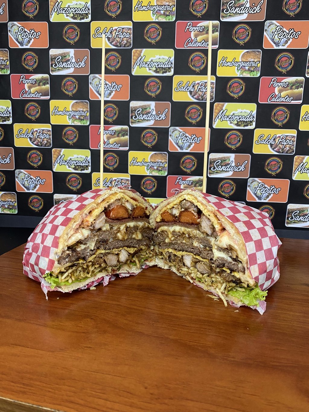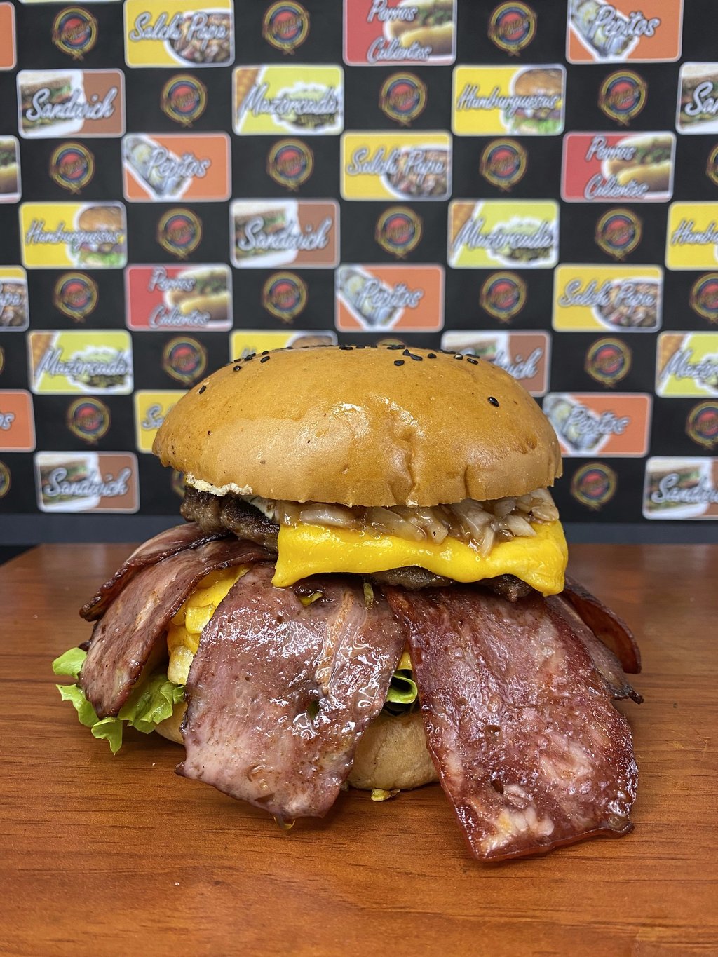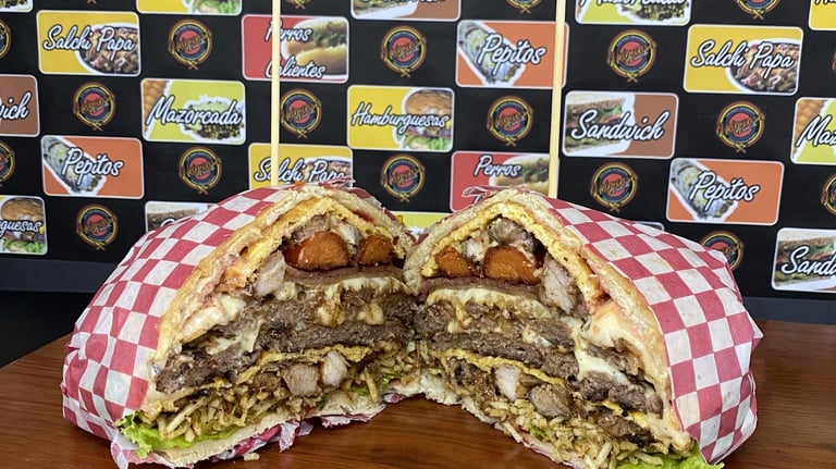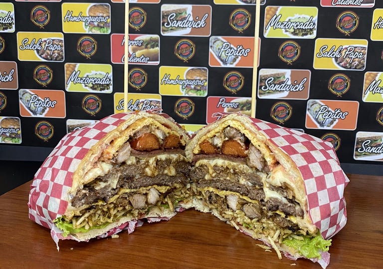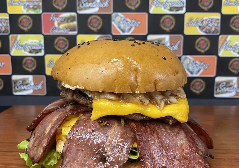Pan de pepito, 2 Carnes artesanales de hamburguesa cada una de 130 gr + 130 gr de proteína entre (Res, Pollo y Cerdo), Lechuga, Tomate, Cebolla grillé, Queso Cheddar y Queso Doble crema, 2 Lonchas de jamón ahumado, 2 Tocinetas, 2 Omelet de huevo con queso, Papas a la francesa, Salsas tradicionales y de la Casa.
