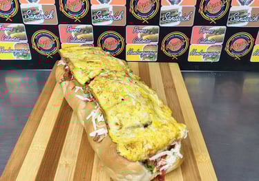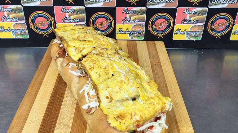 Pan de Pepito, 260 gr de proteína entre (Res, Pollo y Cerdo), Chorizo Ahumado, Jamón ahumado, Omelet de Huevo con queso, Lechuga, Tomate, Cebolla Salteada con la Proteína, Papitas cabello de ángel, Queso rallado, Salsas tradicionales y de la Casa.