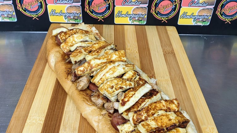 Pan de pepito en Mantequilla de Ajo, 260 gr de proteína entre (Res, Pollo y Cerdo), Chorizo Santarrosano, 160 gr de Queso criollo a la plancha.