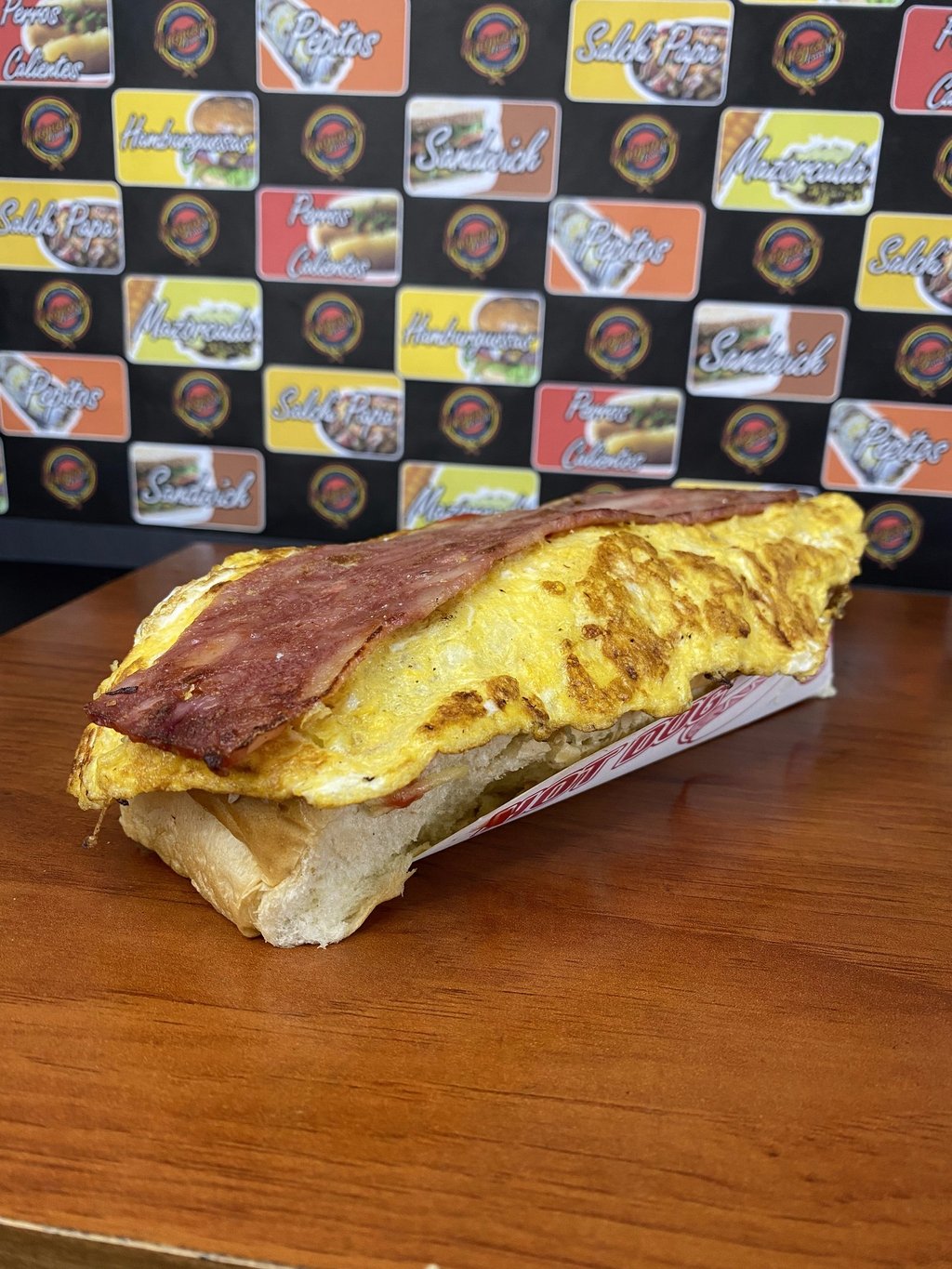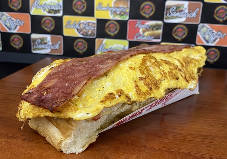 Pan perro, Chorizo Ahumado, Papitas cabello de ángel, Cebolla Grille, Omelet de huevo con queso, Tocineta, Salsas tradicionales y de la casa.