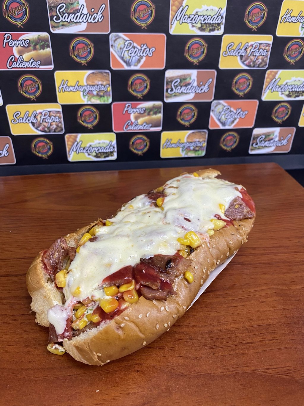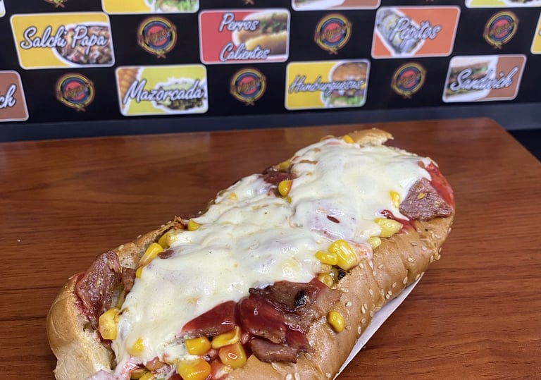 Pan perro, Salchicha Americana, Papitas cabello de ángel, Maíz dulce, Tocineta, Queso gratinado ,Salsas tradicionales.